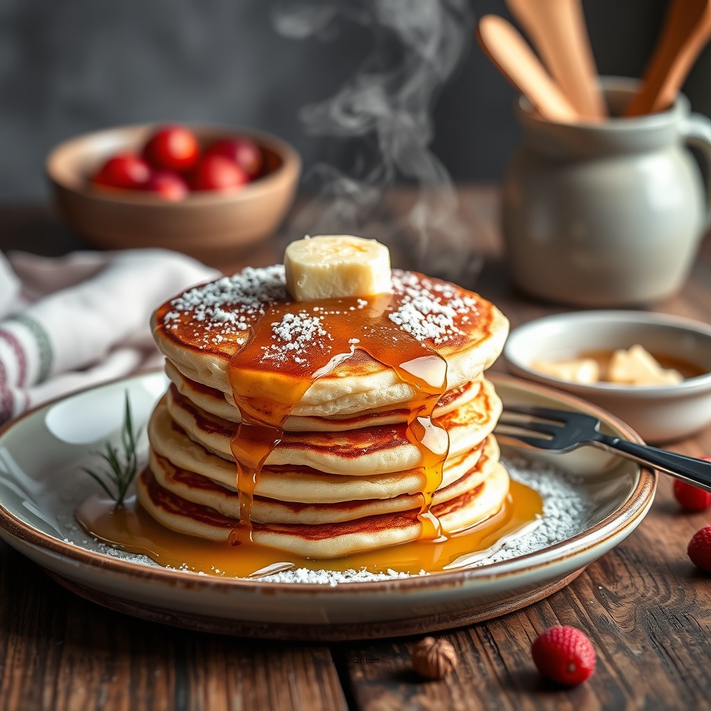Serving style: For a cozy breakfast setting, serve pancakes with a side of crispy bacon or sausage. Alternatively, you can create a pancake bar with various toppings laid out for guests to customize their creations.